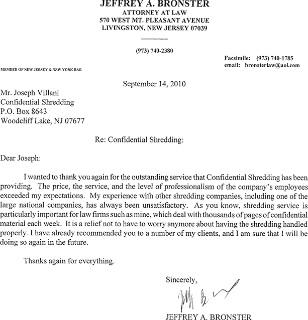 Thank you for the excellent service you have provided to us. As a financial consultant firm we generate confidential information from our customers. The recent increase in credit card fraud, identity theft and government regulations lead us to look for a means to destroy our confidential information. Knowing that our confidential information is being destroyed right in our parking lot takes away a major security concern for our employees.